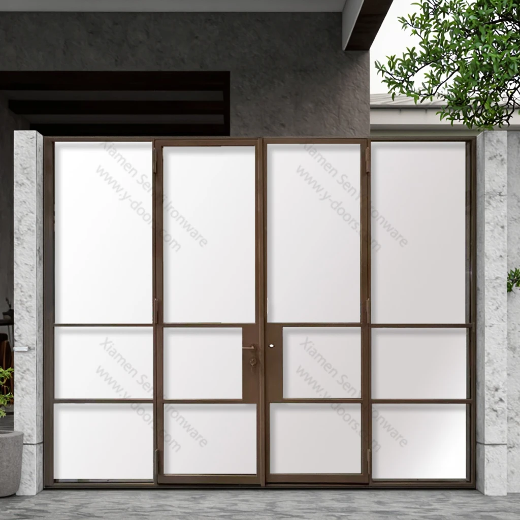 Equipped with high-quality tempered glass (8mm as standard, with frosted, textured, or tinted variants available), the door floods entryways with natural light while ensuring safety and impact resistance, adhering to strict international standards. The versatile surface treatments—including prime coating, powder coating, baking varnish, and 2 pac. paint—deliver superior corrosion resistance, protecting the iron frame from rust, fading, and weather damage, even in humid coastal regions or harsh inland climates. The double door configuration offers wide, unobstructed access, ideal for grand entrances or spaces requiring seamless flow, while the precision-engineered hinges and locking systems ensure smooth operation and reliable security. Backed by over 10 years of industry expertise, our team provides comprehensive customization, including tailored sizes, color matching (from classic matte black to custom hues), and decorative ironwork details, supported by detailed AutoCAD drawings to ensure a perfect fit for any entry opening. Each Modern French-Style Iron Framed Double Door undergoes rigorous quality control, from raw material inspection to final assembly, guaranteeing consistent performance and reliability for B2B clients worldwide. With no minimum order quantity and volume-based discounts, this double door adapts seamlessly to projects of all scales, from single-villa renovations to large-scale residential or commercial developments.